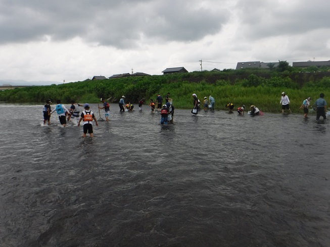 第一地点目の狐川(JR花堂駅前)では、ふだん川に入ることのないこどもたちは、やや濁った川に緊張した様子で入りましたが、第二地点目の足羽川では、ようやく川にも慣れ元気よく楽しそうに水生生物を採集していました。あまりの暑さに泳ぎだす児童もいました。